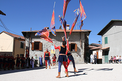 Il corteo si ferma nella piazza principale del borgo per un prima esibizione dei giochi di bandiera.